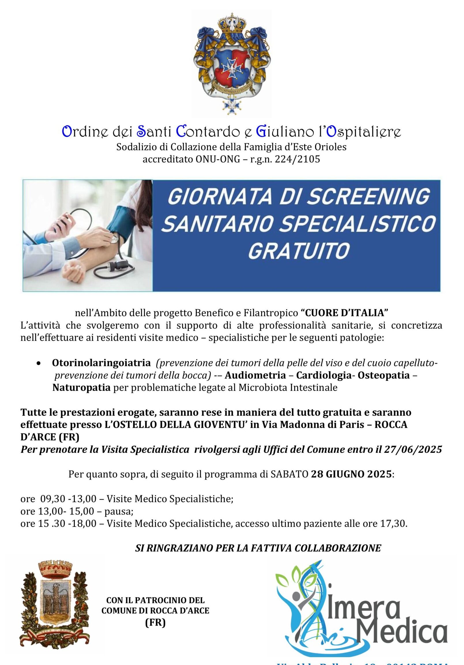 Sabato 28 Giugno 2025, nel Comune di Rocca d’Arce (FRS) l’Ordine dei Santi Contardo e Giuliano l’Ospitaliere ha effettuato uno screening sanitario gratuito alla Popolazione residente. Ospiti dell’Ostello della Gioventù, moderna e funzioanale struttura di proprietà del Comune, grazie alla sensibilità del Sindaco il Dott. Rocco Pantanella ha ospitato lo staff sanitario composto da Medici Specialisti e Operatori delle Professioni Sanitarie, dove già dalle ore 9,00 del mattino hanno avviato l’attività medico diagnostica.
